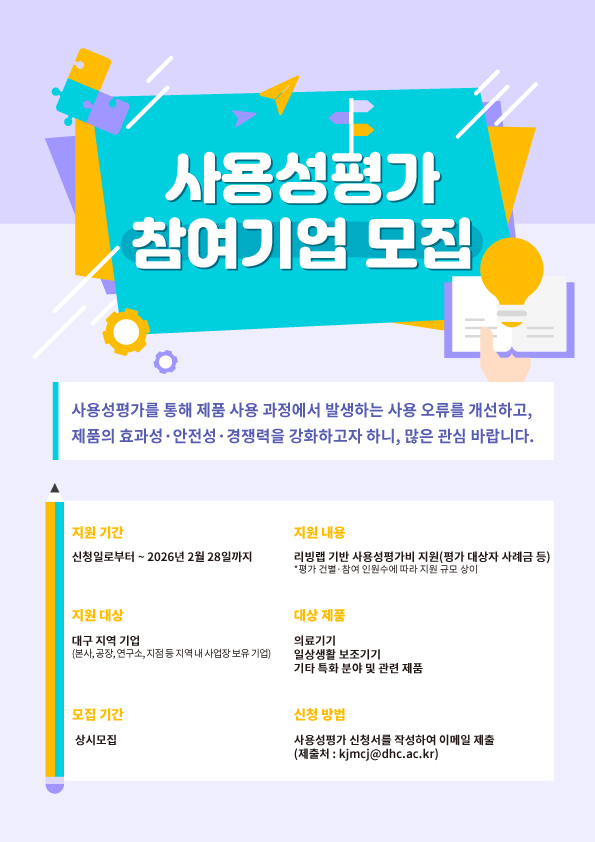 라이프케어산업기술원에서는 지역 기업의 제품 경쟁력 강화를 위해 리빙랩 기반 사용성평가 지원을 진행합니다. 의료기기 및 보조기기 분야 기업들의 많은 관심과 참여를 바랍니다.
